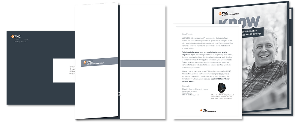 PNC Bank, not being top of mind for high net worth individuals when it comes to managing their portfolios, and providing more personalized financial planning. This mailing set out to change that. The design of the kit needed to adhere to the PNC brand, but also elevate it to give PNC the cache it needed with this audience.